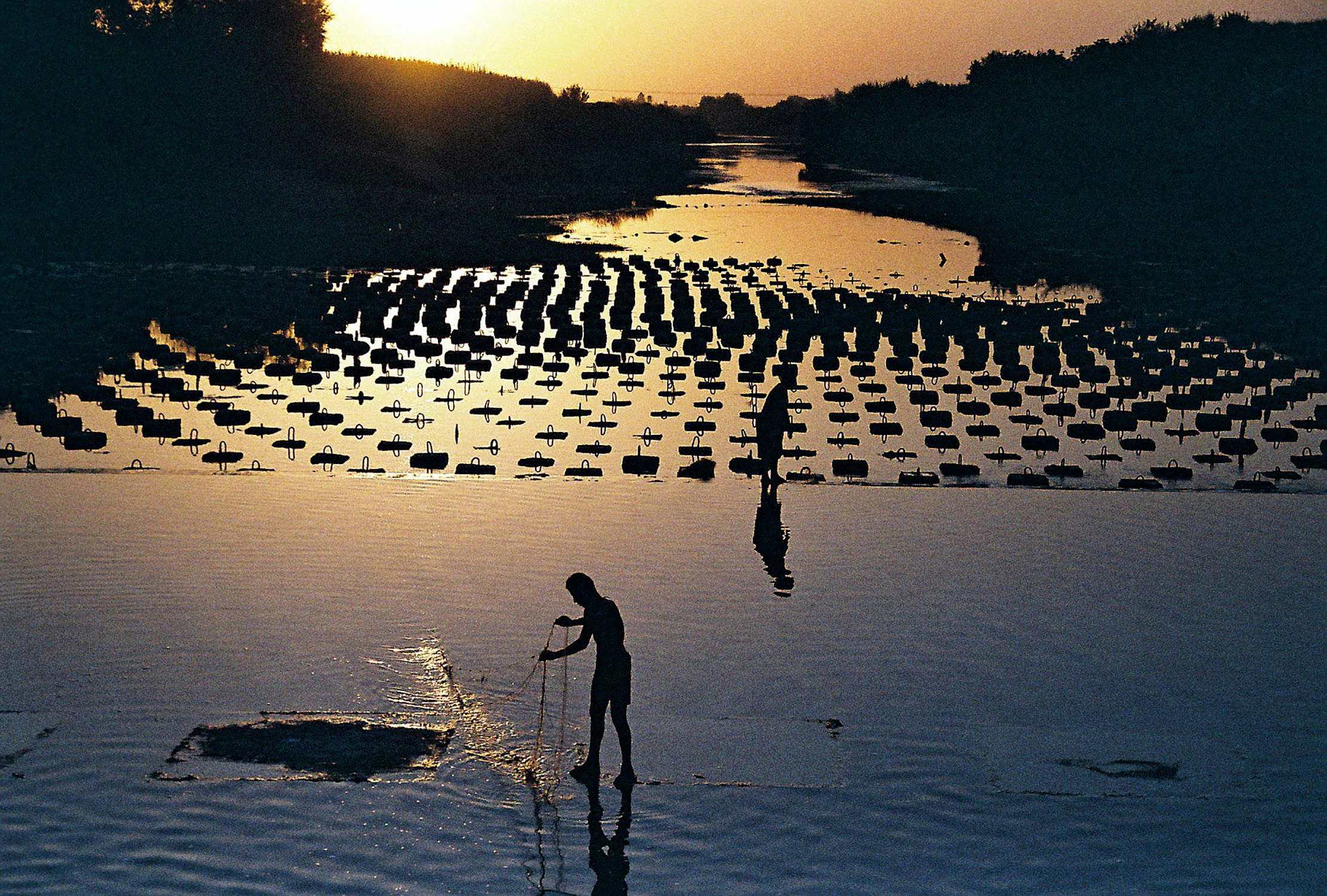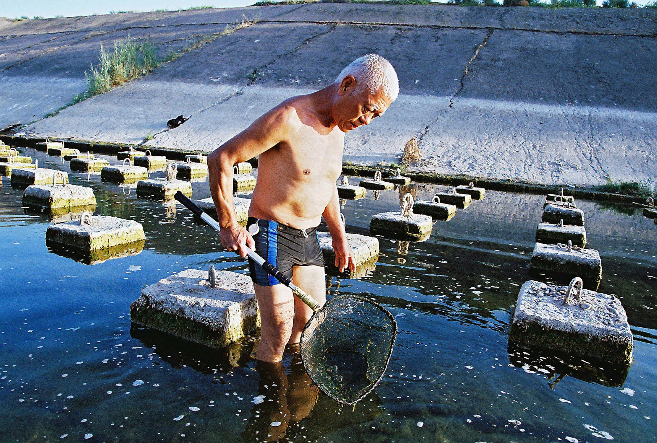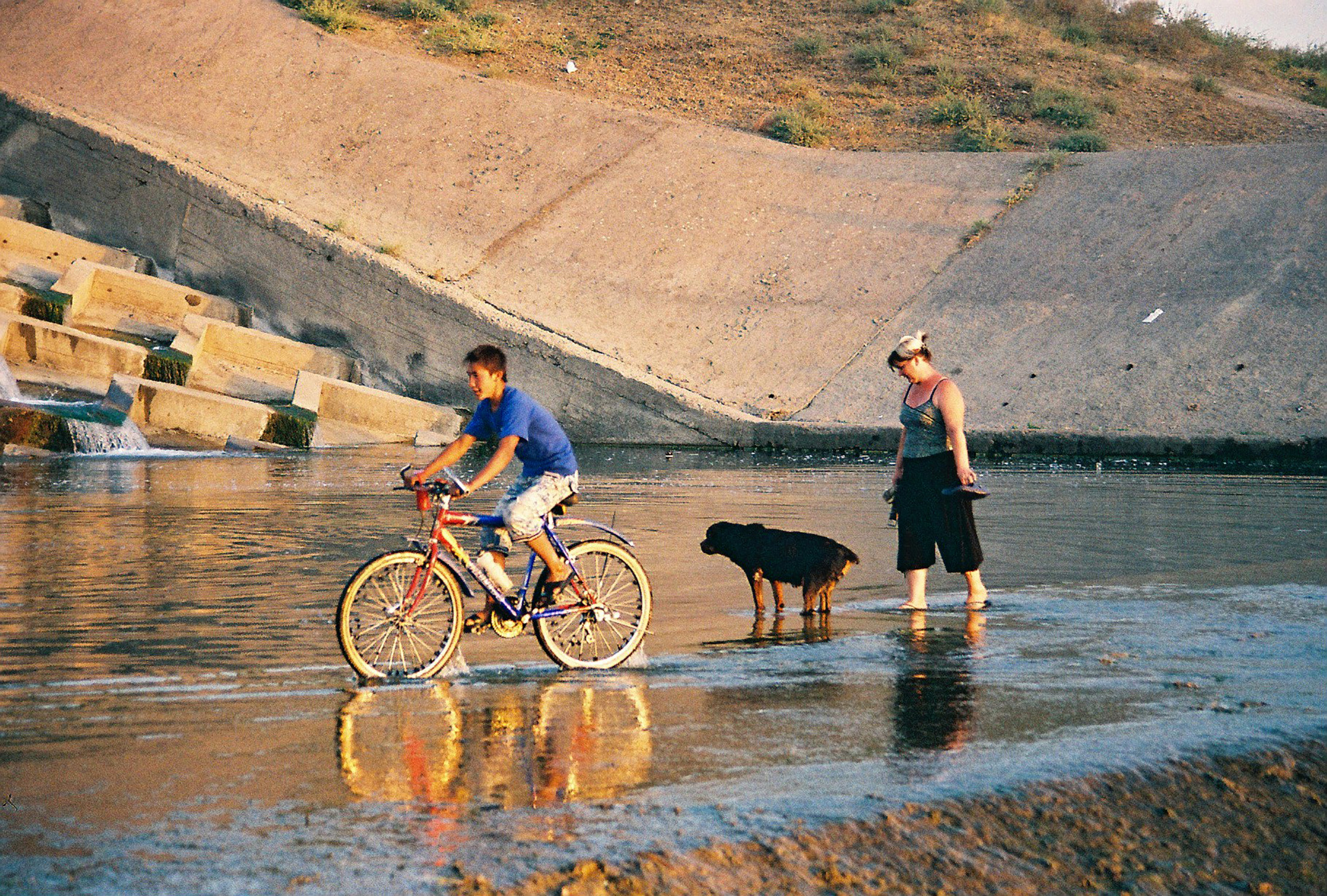 Если от плотины спуститься направо, куда из озера по каналу спускается вода, через полкилометра перед глазами предстанут железный мост и водосброс. Здесь дикий пляж; люди плавают, прыгают с моста, а некоторые охотятся за речными креветками, которых вылавливают целыми ведрами. Это место именуется «Семиочковым» (мне объясняли, что в водосбросе семь отверстий). Оно, в основном, посещается жителями ближайших поселков, в том числе самого Туябугуза (Ташморя). Среди отдыхающих немало корейцев, ведь вокруг бывшие корейские колхозы и совхозы, хотя основная часть их населения давно перебралась в города.