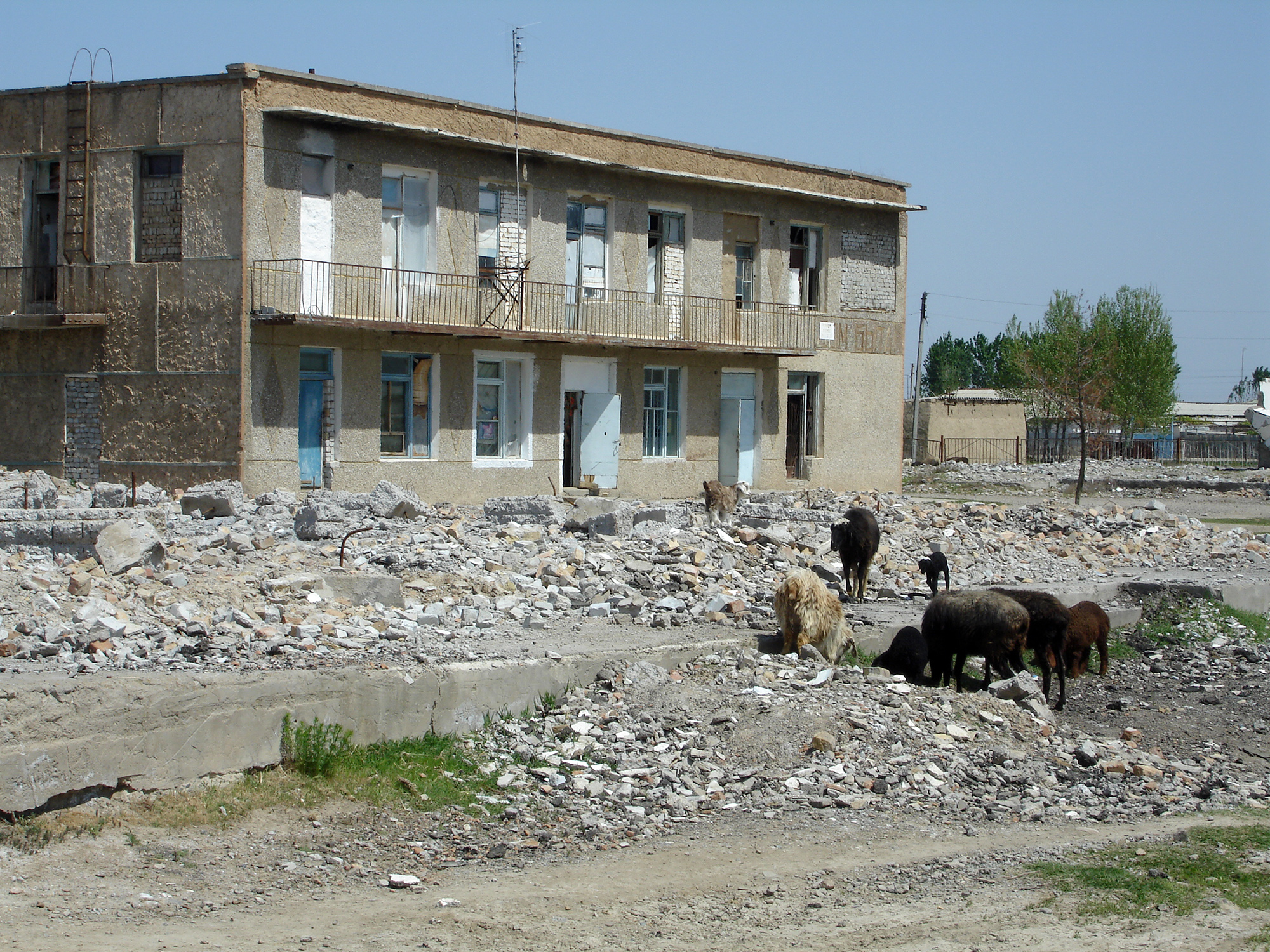 Центр поселка таков. Ряды пеньков, образующих правильный квадрат - лет десять назад здесь росли деревья. В центре квадрата - одинокая будка туалета. И куда ни кинешь взгляд – разобранные дома, магазины, груды обломков, развалины. Поселок по камешку разбирается на стройматериалы. Он перестает быть прямо на глазах. Дома и здания превращаются в руины так быстро, что кажется будто здесь промчались орды Чингизхана.