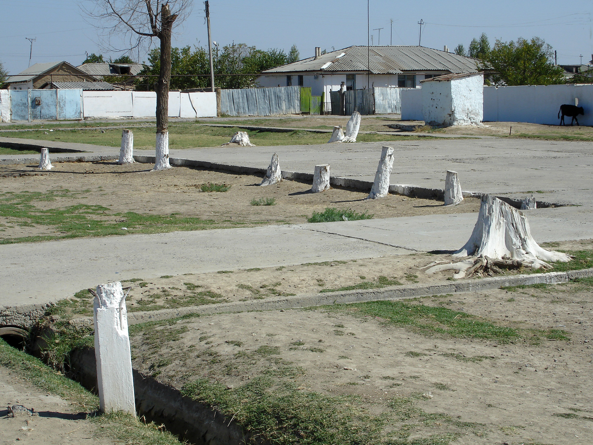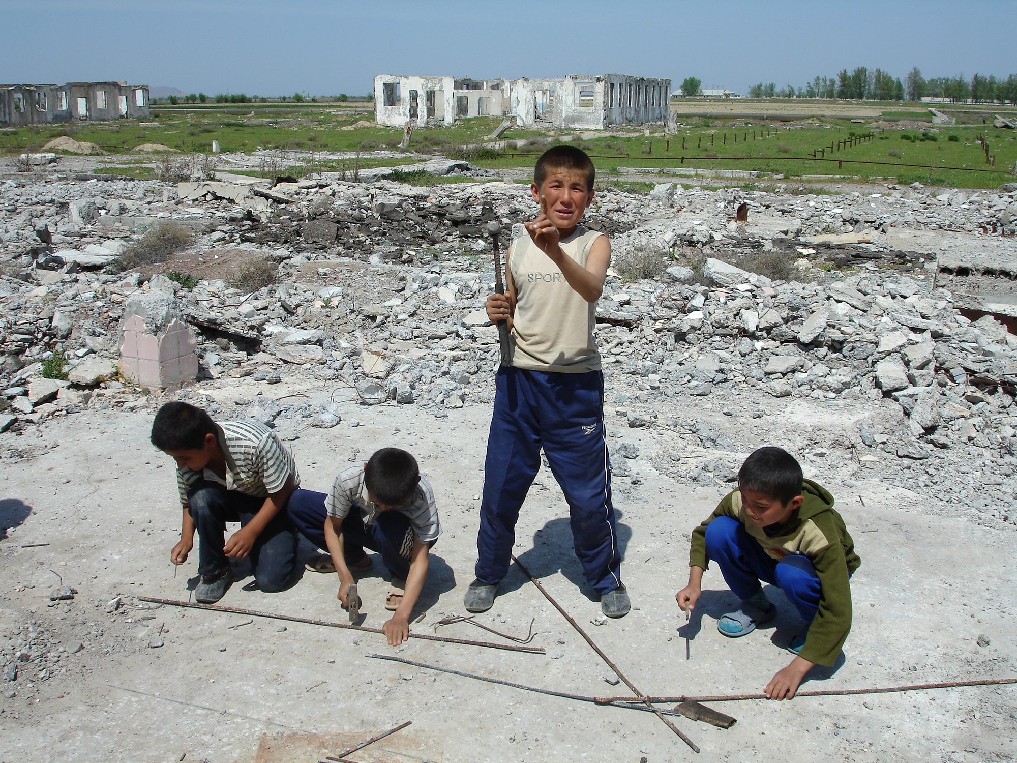 Заезжаем в совхоз, к которому раньше относилась эта фабрика. Теперь он, разумеется, переименован. Сейчас он носит имя Байтурганова (бывший председатель). Опять разобранные корпуса, на развалинах которых орава детей молотками разбивает бетонные блоки, вытаскивая из них тонкие прутики арматуры. Их они продают по 100 сумов за метр ($ 0,12).