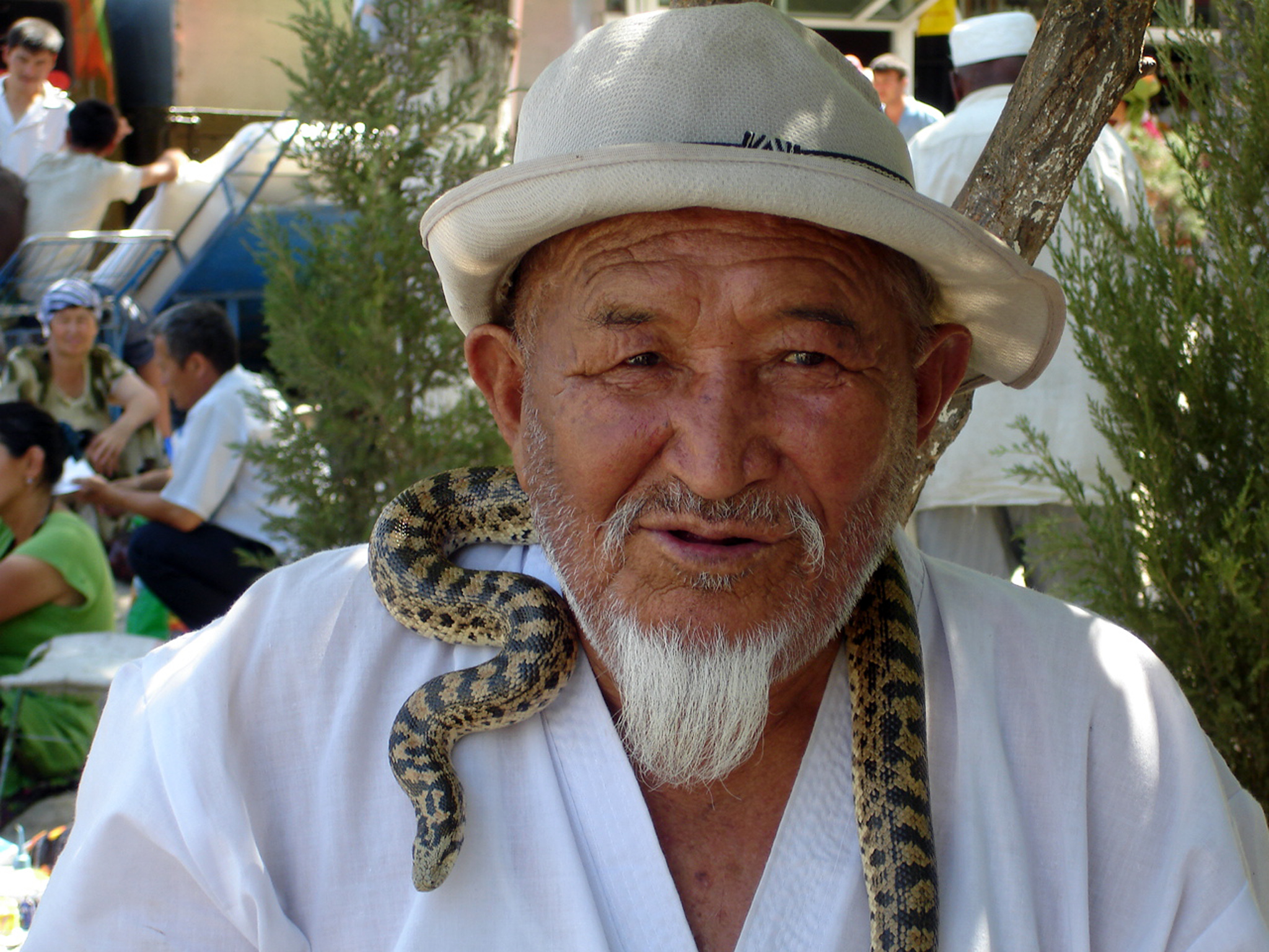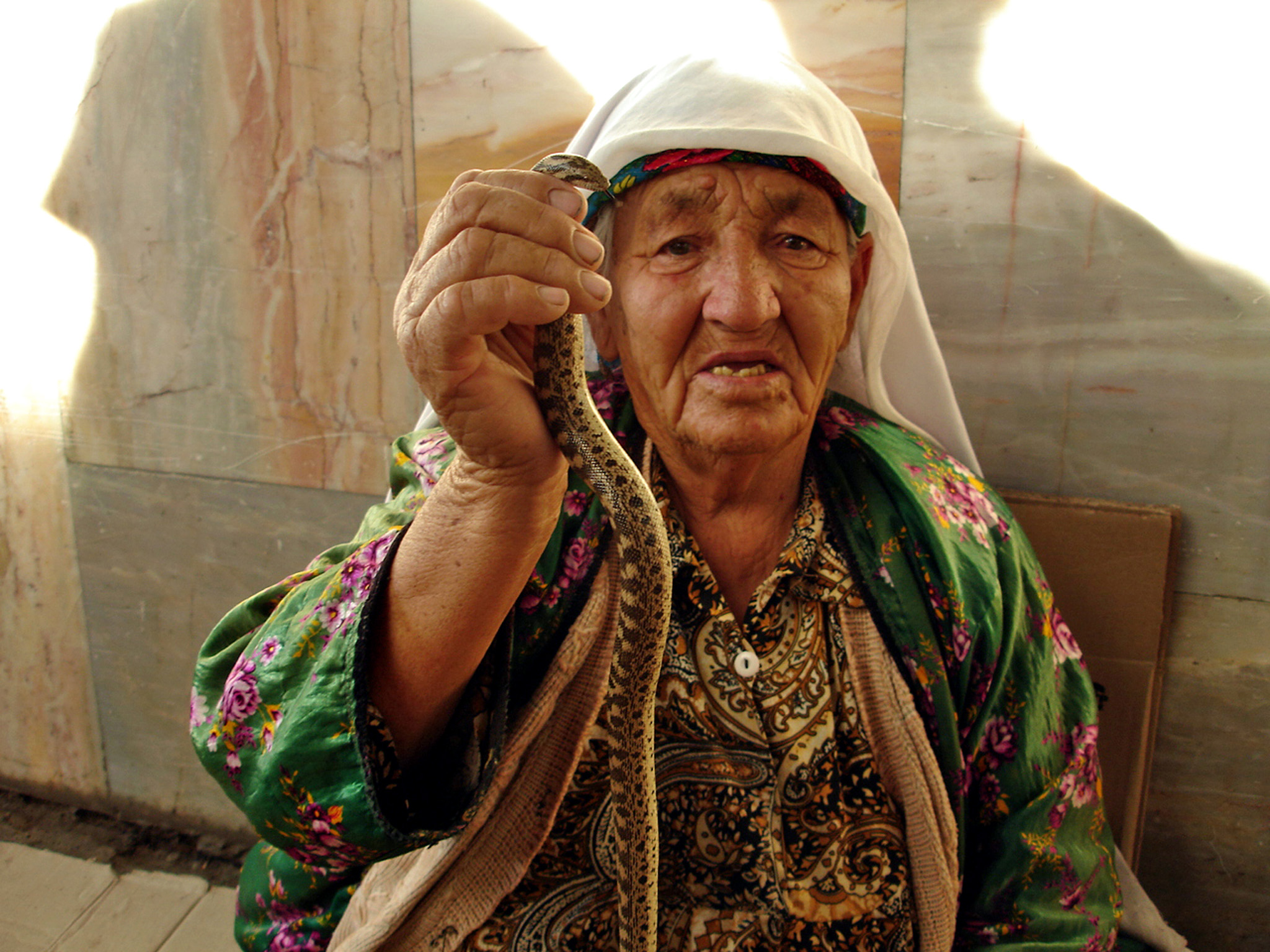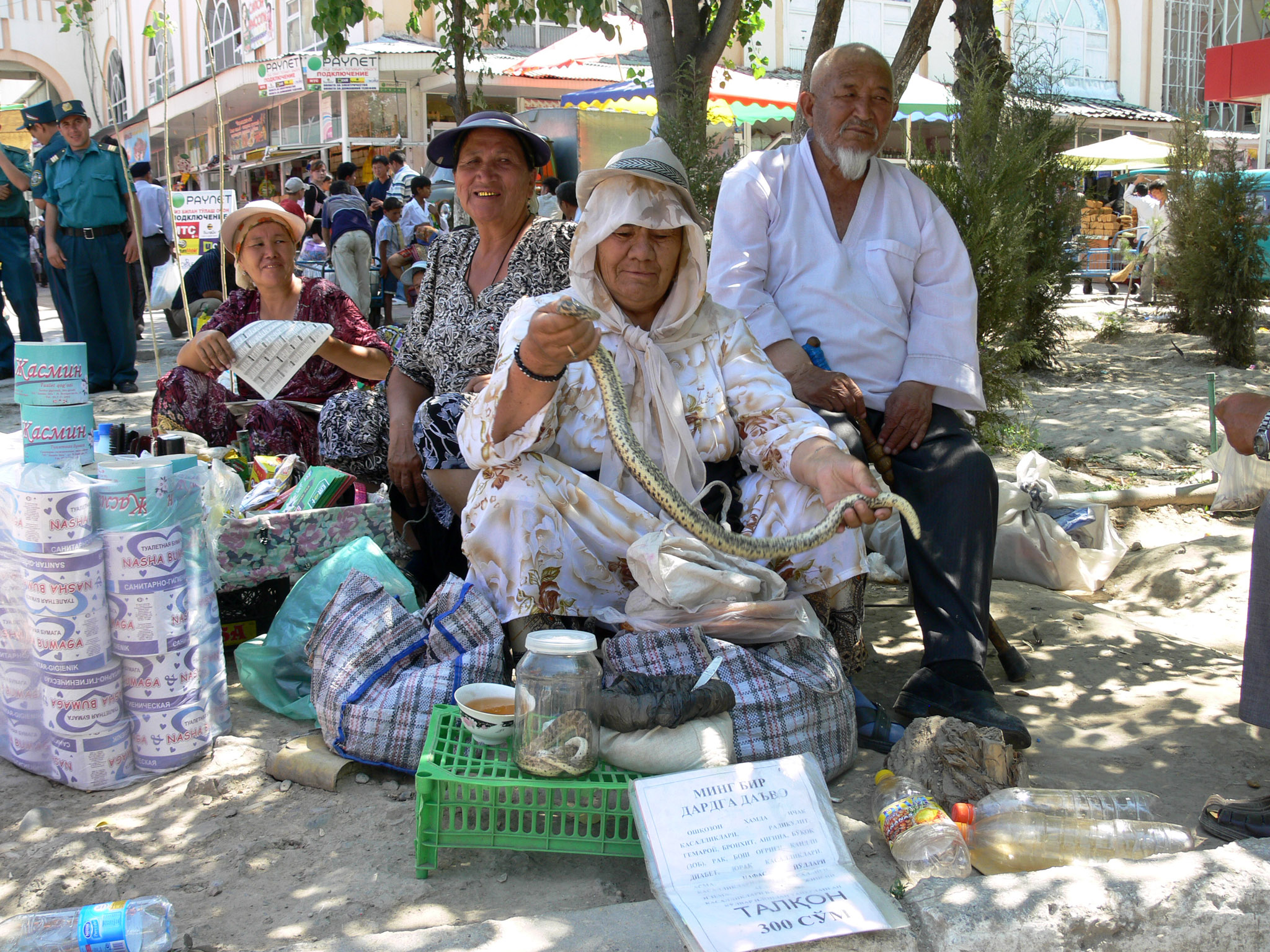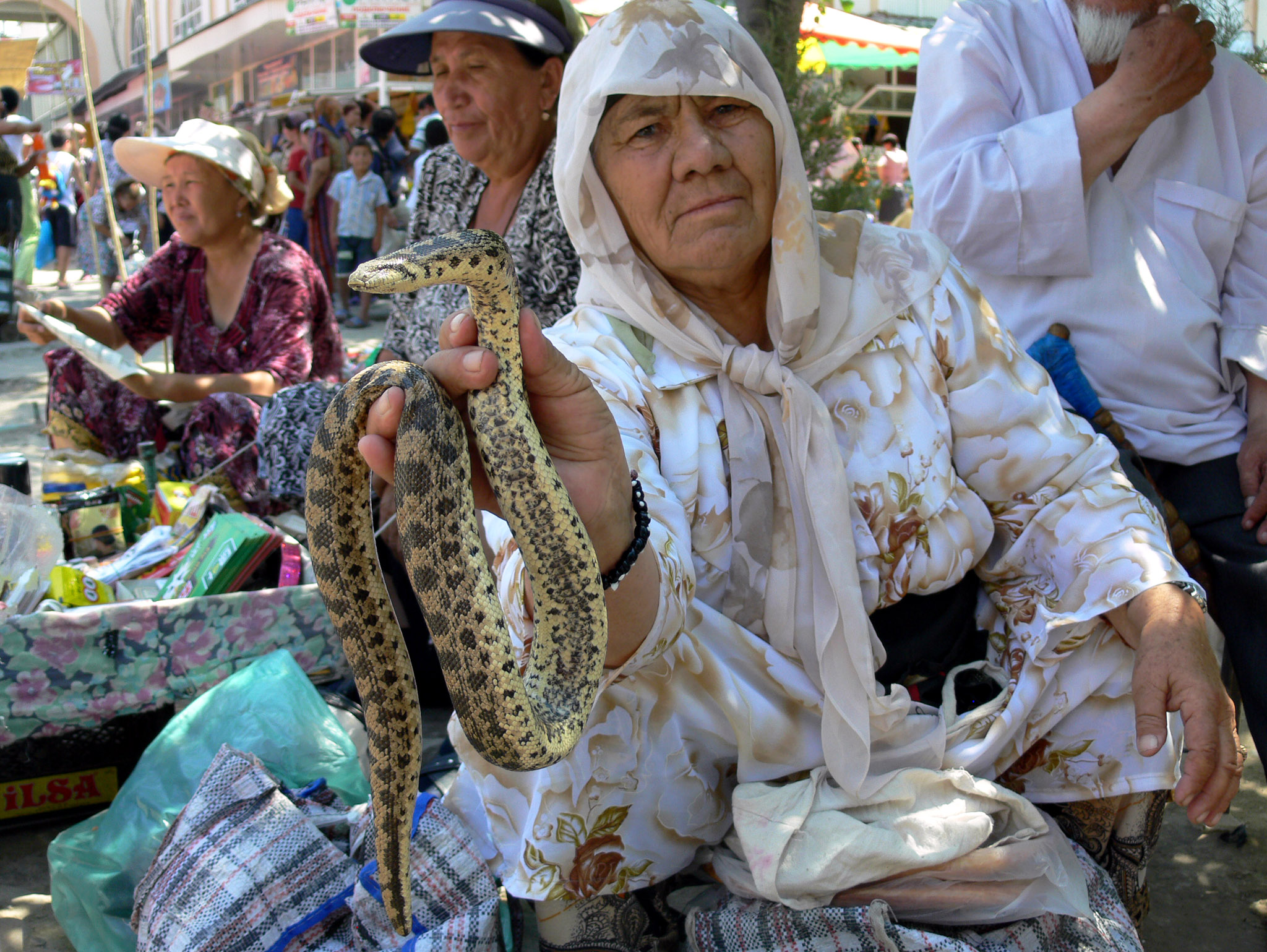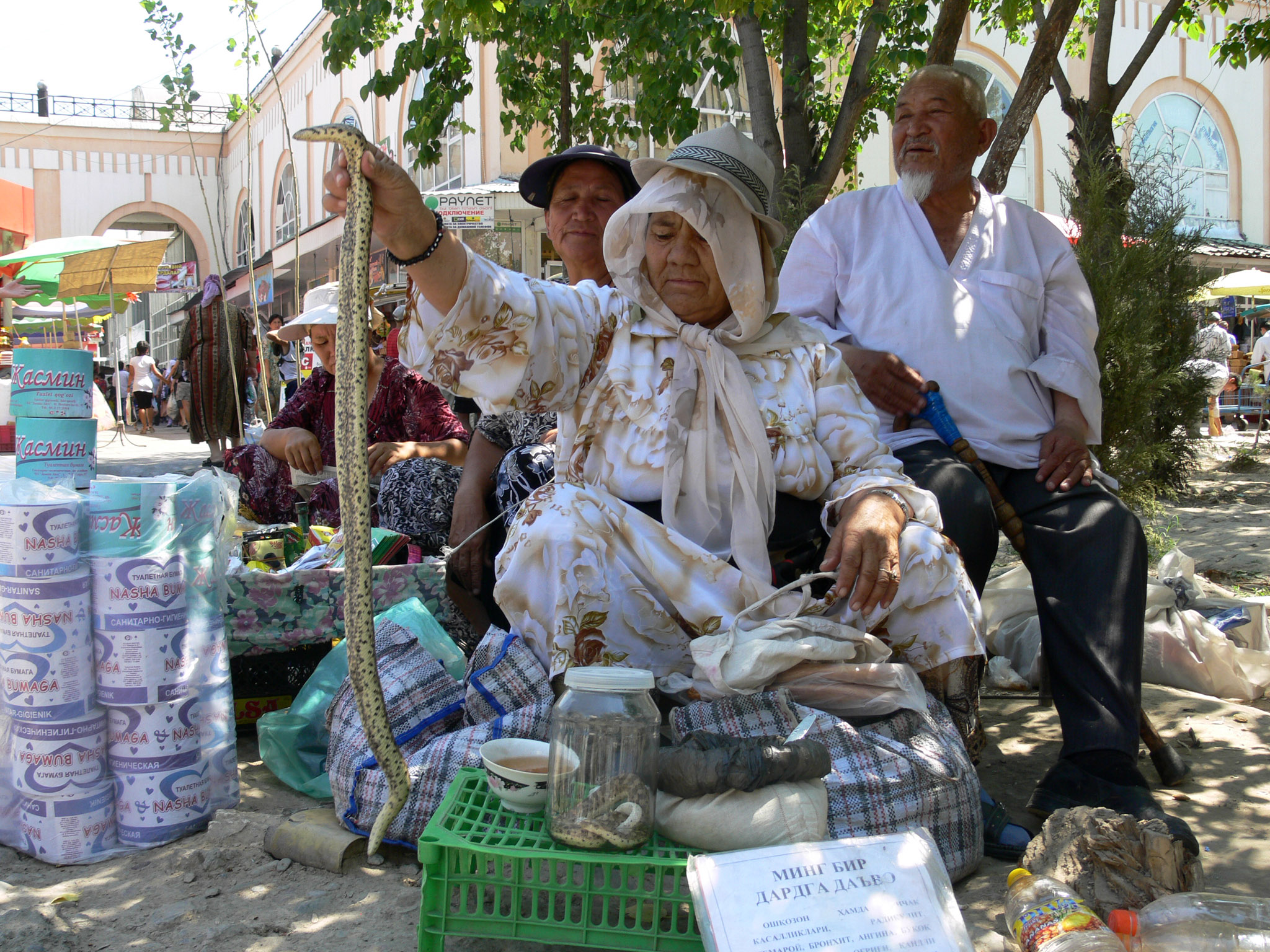 «Лекарство от 1001 болезни», - гласит рекламная табличка перед торговцем змеями на одном из ташкентских базаров. Ниже прилагается перечень недугов, от которых оно будто бы избавляет: желудочно-кишечные и сердечно-сосудистые заболевания, радикулит, геморрой, бронхит, ангина, зоб, рак, головная боль, сахарный диабет, астма, заболевания дыхательных путей и почек, экзема, женские половые болезни и т.д. Если поверить на слово, то получается что змеиное мясо – чудесная панацея, универсальное средство от всех болезней, не доходящее до аптечных прилавков то ли по причине излишнего консерватизма медицинской сферы, то ли из-за заговора врачей.