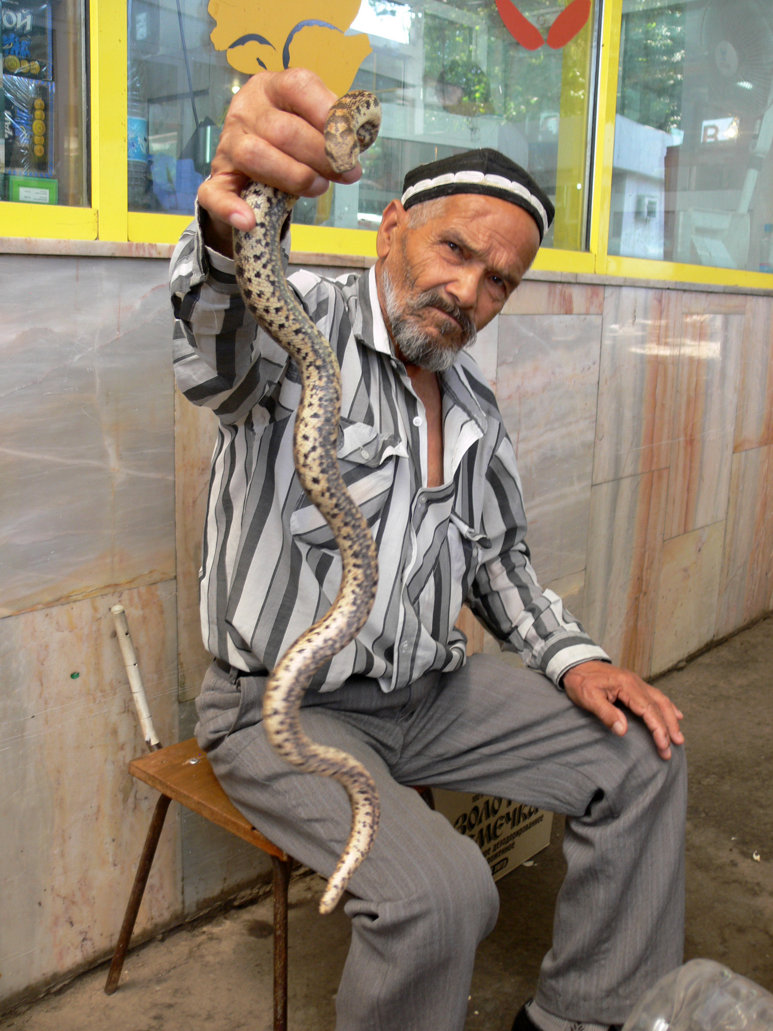 Так, на Фархадском базаре столицы, не обнаружив привычного старика или пожилой женщины с этой специфичной продукцией, я обратился за помощью к торговке зеленью, которая переадресовала меня к продавцу петухов, а тот к соседнему парню (не помню, что у него было разложено для прикрытия). Парень сразу стал спрашивать, какая змея мне нужна и от какой болезни. Потом сообщил, что дома у него их штук десять лежат, ждут заказчиков. Привозят их из Зааминского района Джизакской области. «Из змеи надо сделать шурпу», - пояснил он. Потом рассказал, что иногда они с друзьями втроем-вчетвером собираются и сами готовят змеиный суп, «чтоб никакая болезнь не брала!».