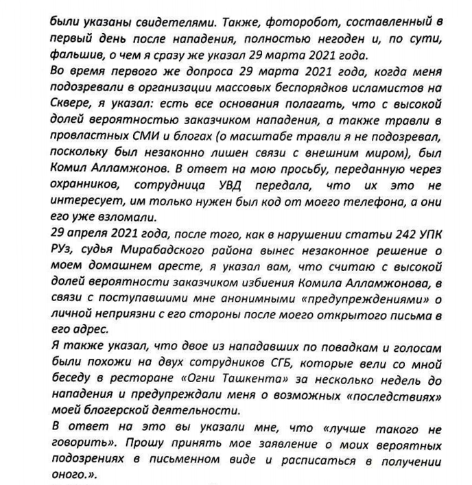 29 апреля 2021 года, после того как в нарушение статьи 242 УПК РУз, судья Мирабадского района вынес незаконное решение о моем домашнем аресте, я указал вам, что считаю с высокой долей вероятности заказчиком избиения Комила Алламжонова, в связи с поступавшими мне анонимными «предупреждениями» о личной неприязни с его стороны после моего открытого письма в его адрес.