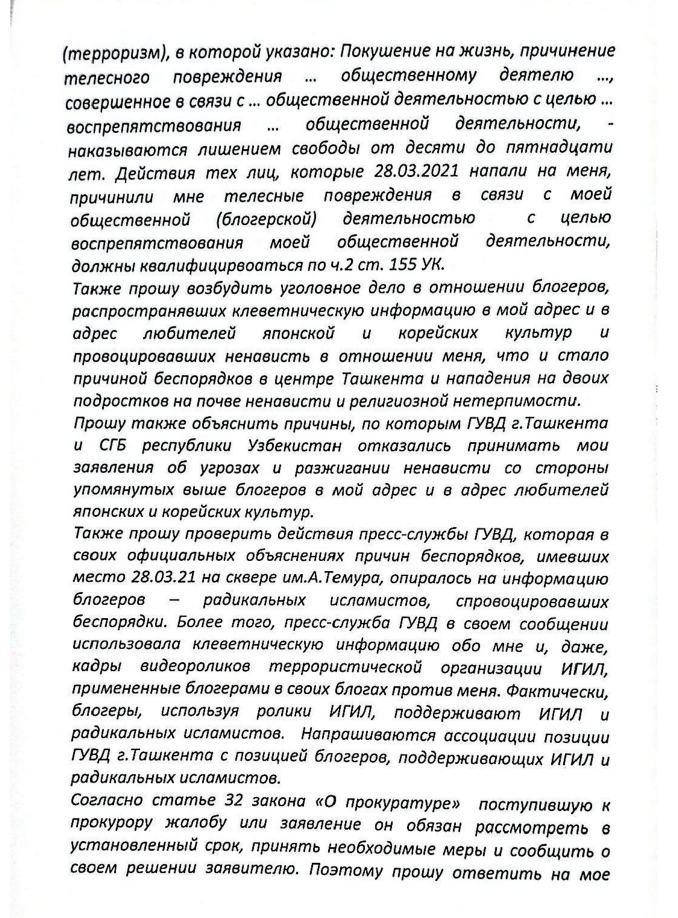 Также прошу возбудить уголовное дело против блогеров, распространивших клеветническую информацию в мой адрес и в адрес любителей японской и корейской культур и провоцировавших ненависть в отношении меня, что и стало причиной беспорядков в центре Ташкента и нападения на двух подростков на почве ненависти и религиозной нетерпимости.