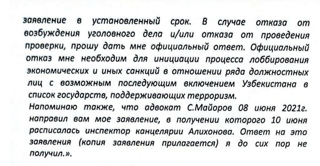 Согласно статье 32 закона «О прокуратуре», поступившую в прокуратуру жалобу или заявление она обязана рассмотреть в установленный срок, принять необходимые меры и сообщить о своем решении заявителю. Поэтому прошу ответить на мое заявление в установленный срок. В случае отказа от возбуждения уголовного дела и/или отказа от проведения проверки, прошу дать мне официальный ответ. Официальный отказ мне необходим для инициации процесса лоббирования экономических и иных санкций в отношении ряда должностных лиц с возможным последующим включением Узбекистана в список государств, поддерживающих терроризм.