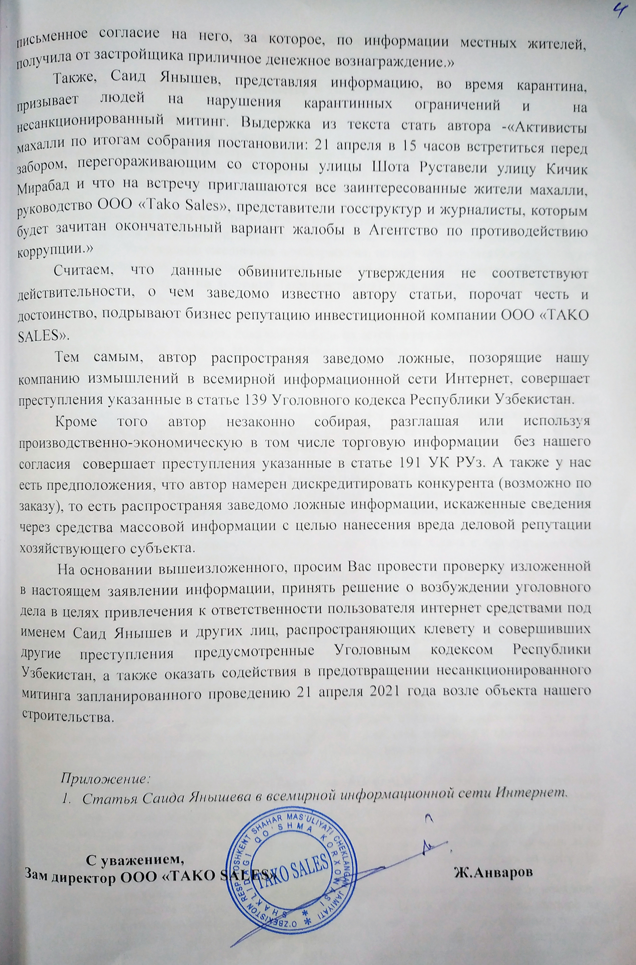 Директор школы уведомляла, что он беспочвенно обвинил её в предоставлении разрешения на стройку за денежное вознаграждение. Заявление компании «Tako Sales» было более обширным и разнообразным. Например, в нем говорилось: «В своей статье автор (…) используя средства массовой информации и социальные сети, распространяет об OOO «Tako Sales» заведомо ложные сведения, порочащие честь и достоинство компании, а также подрывает бизнес-репутацию инвестора, активного участника инвестиционного рынка, вкладывающего значительные ресурсы, в том числе и финансовые, в развитие города Ташкента». «Кроме того автор необоснованно и своей клеветой обвиняет нас в подкупе лиц, осуществляющих деятельность в соседних зданиях».