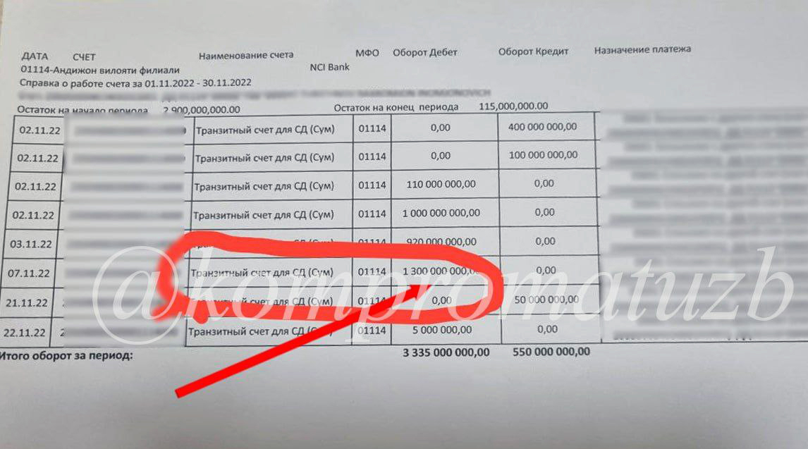 «Изменение депозита. Вклад, внесенный в Инфин Банк (Акционерно-коммерческий банк «Invest Finance Bank» – ред.), был оформлен ваучером по распоряжению зампреда банка. Где 1 миллиард 300 миллионов сумов из 3 миллиардов, внесенных клиентом? Клиенты Инфин Банка становятся ближе. Мы будем информировать вас о доходах владельцев этого банка. Вместо того, чтобы говорить: «Делайте всё, что в ваших силах», наведите порядок. Еще есть шанс»;